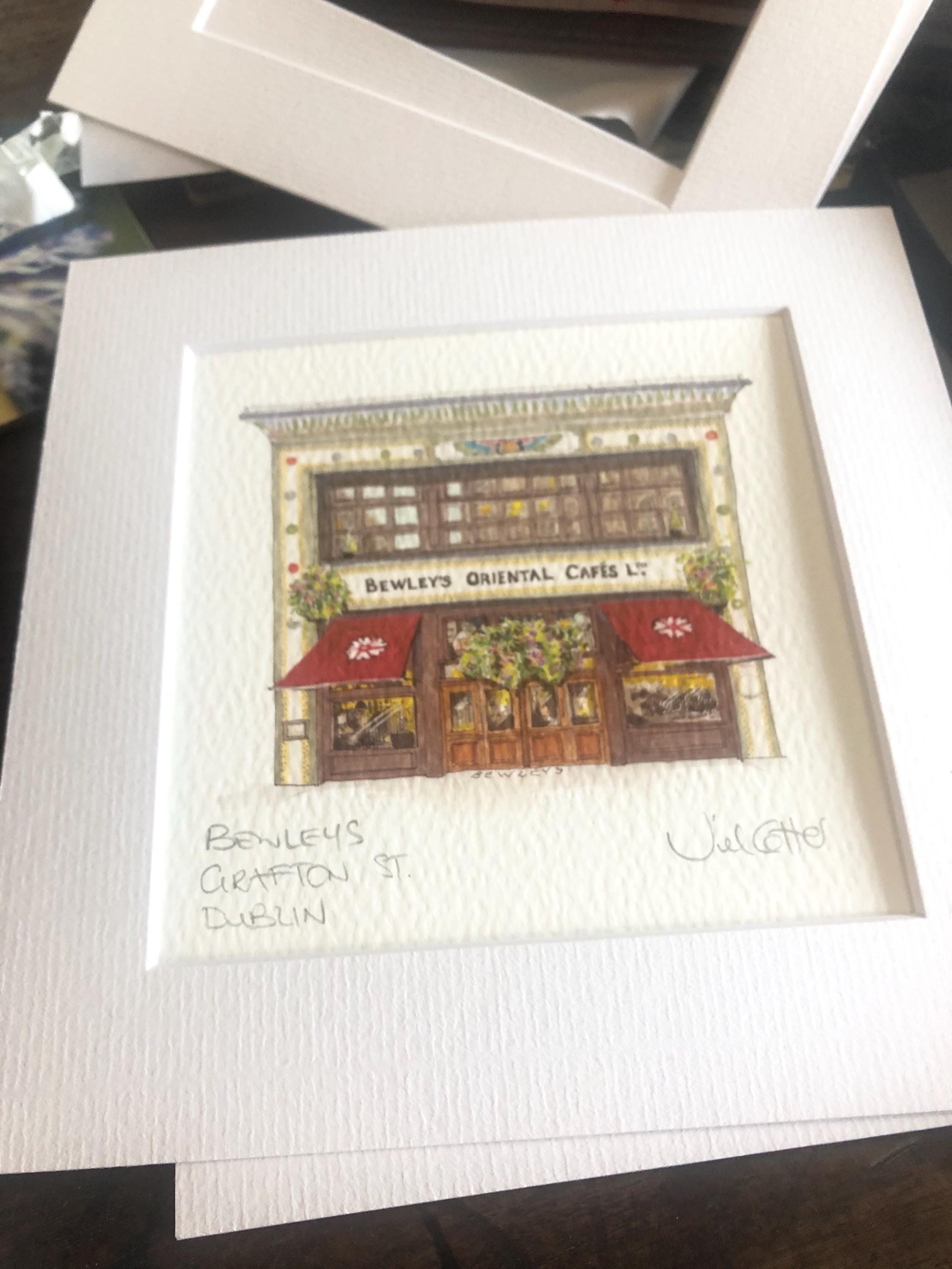 A 7”x7” unframed, mounted print, limited edition and signed, of Bewley’s cafe on Grafton street, Dublin. The most gorgeous cafe steeped in stories and home to some exquisite Harry Clarke stained glass windows.